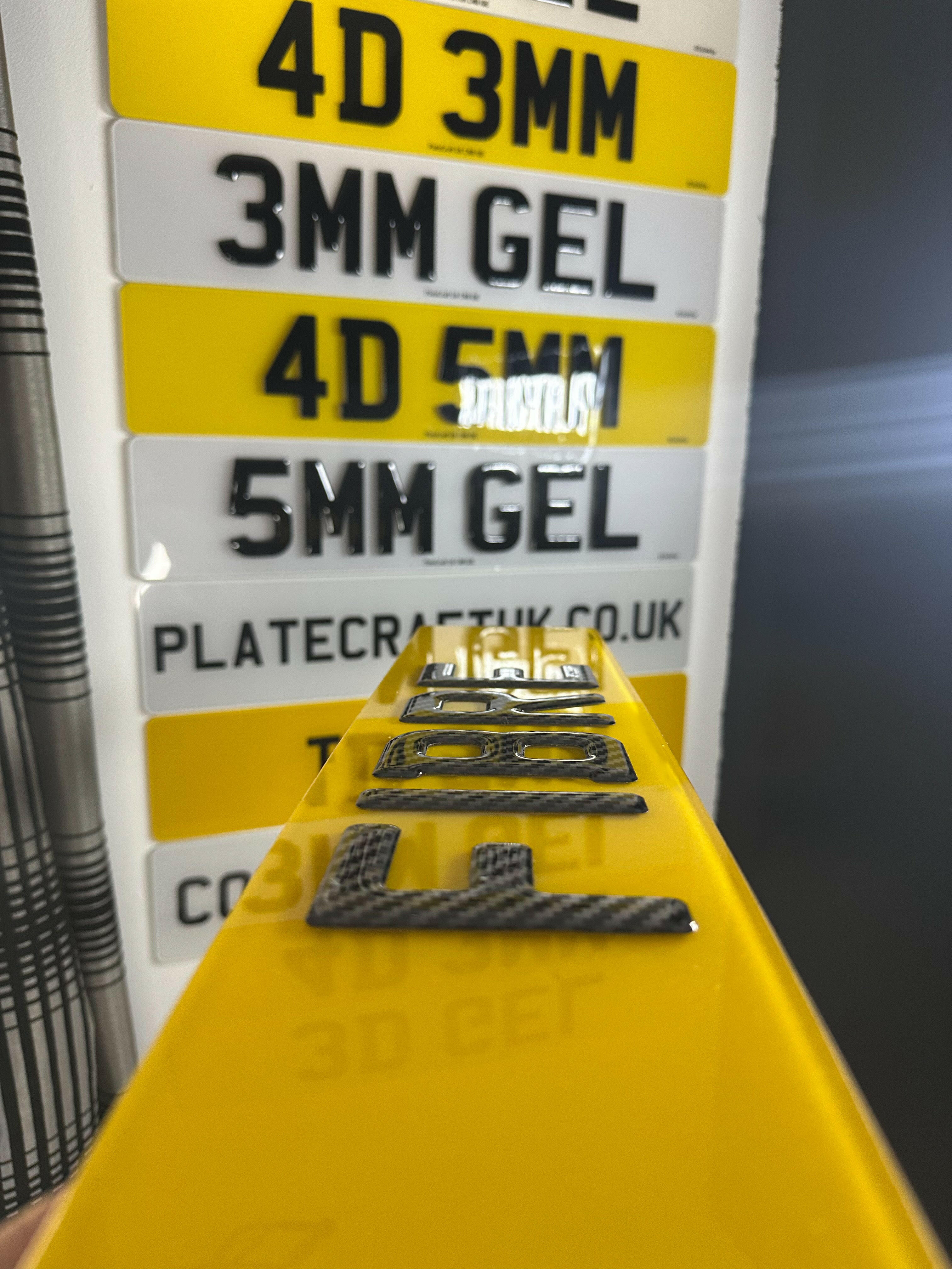 3D plates use gel resin lettering to create a raised, domed effect. 4D plates use laser-cut acrylic characters that sit even higher on the plate surface, creating a bolder and more defined appearance. Both styles are legal and offer a premium, eye-catching look.