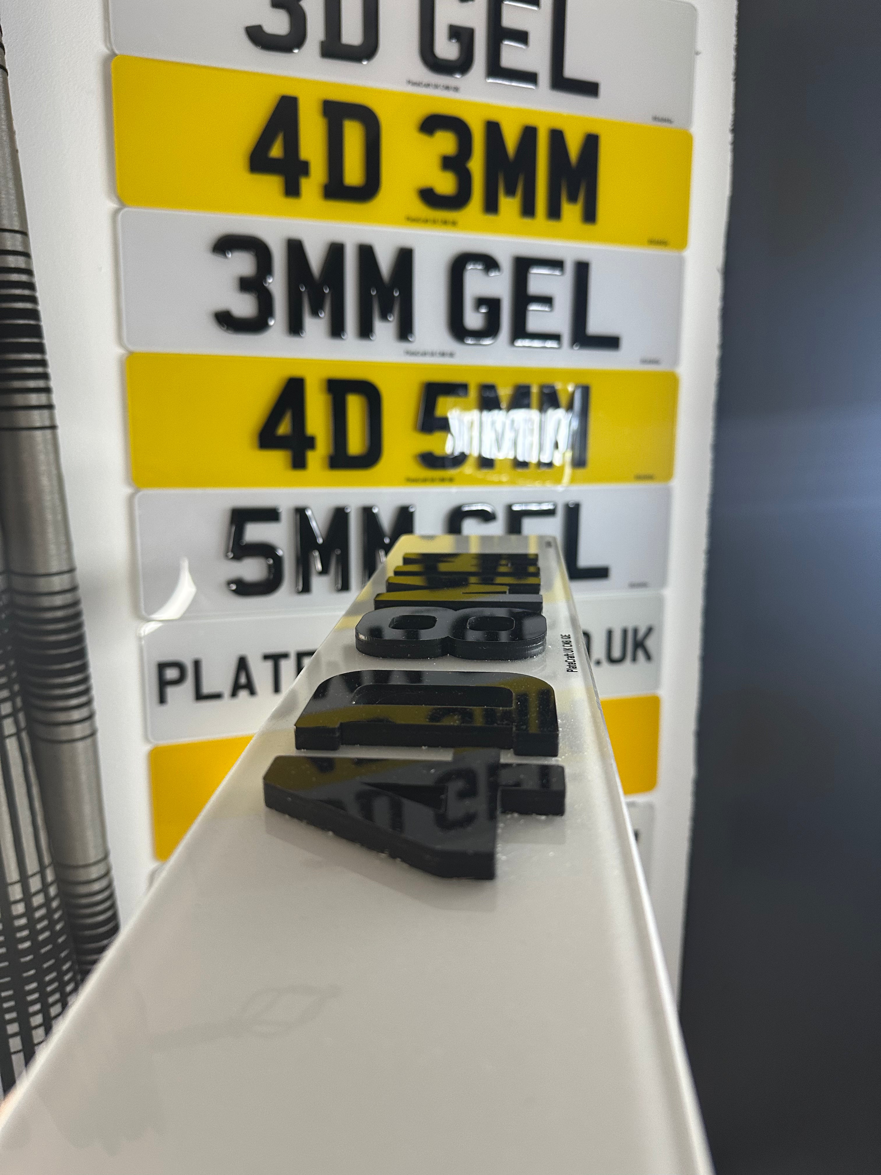 3D plates use gel resin lettering to create a raised, domed effect. 4D plates use laser-cut acrylic characters that sit even higher on the plate surface, creating a bolder and more defined appearance. Both styles are legal and offer a premium, eye-catching look.